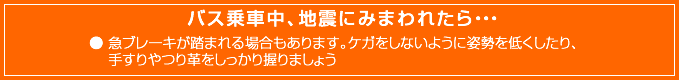 ●座席に座っている場合には、低い姿勢をとって頭部を鞄などで保護し、立っている場合には手すりやつり革をしっかり握って転倒しないようにしましょう。